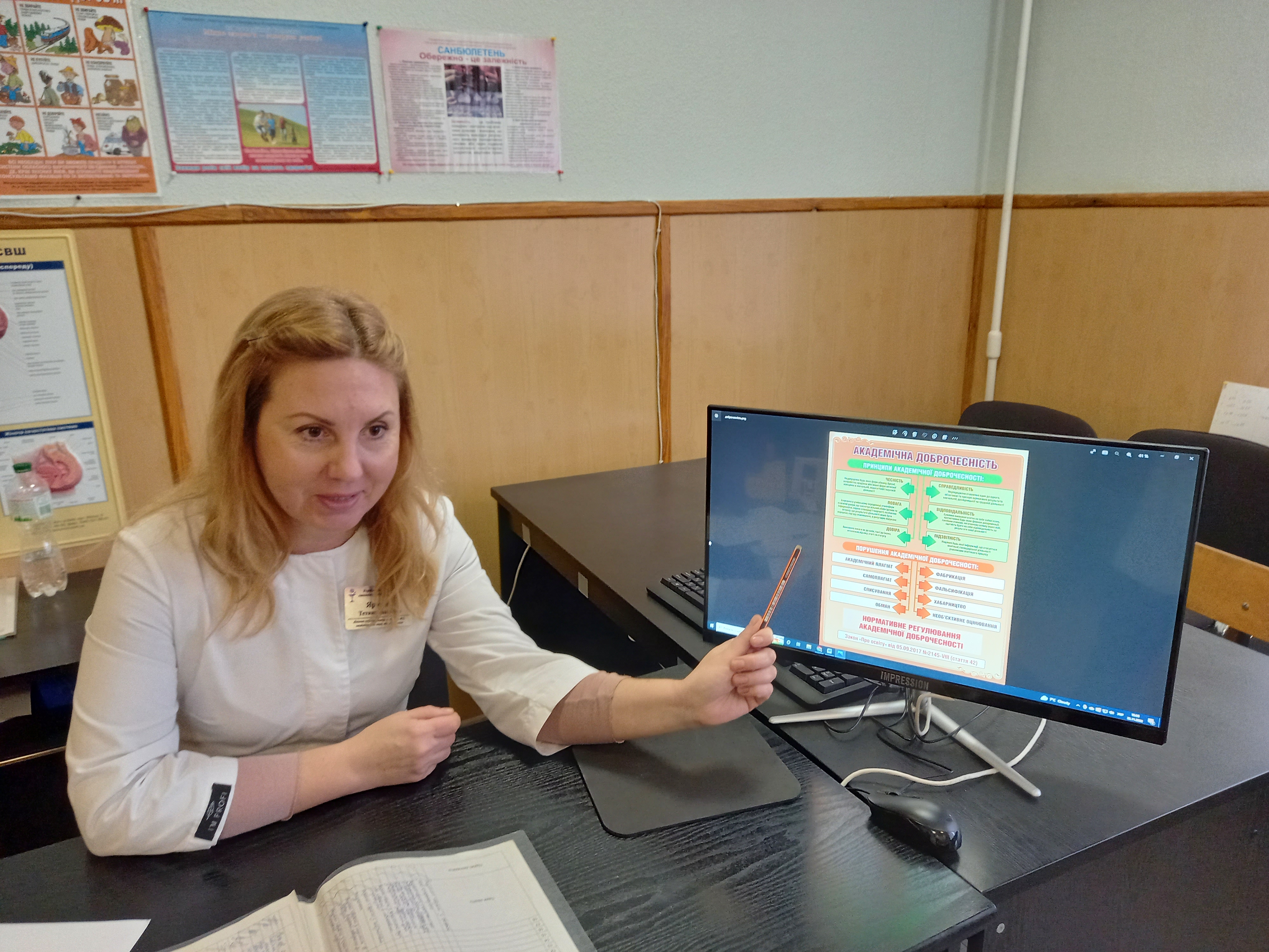 З часу набуття чинності нового «Закону про освіту», академічна доброчесність стає невід’ємною частиною освітнього процесу, а її порушення – загрозою для кожного здобувача освіти. Та чи відомо це самим здобувачам вищої медичної освіти? З таким запитанням 22.11.2022 року доц. Пустовойт Г.Л., доц. Ткаченко Л.А. та доц. Ярмола Т.І звернулися до ЗВО 6-го курсу під час проведення планової інтерактивної виховної години. Були обговорені основні моменти академічної доброчесності серед студентської молоді та наголошено, що чесне здобуття якісної освіти є ключем до успіху України, а молодь має будувати кар’єру покладаючись на власні сили та можливості.
